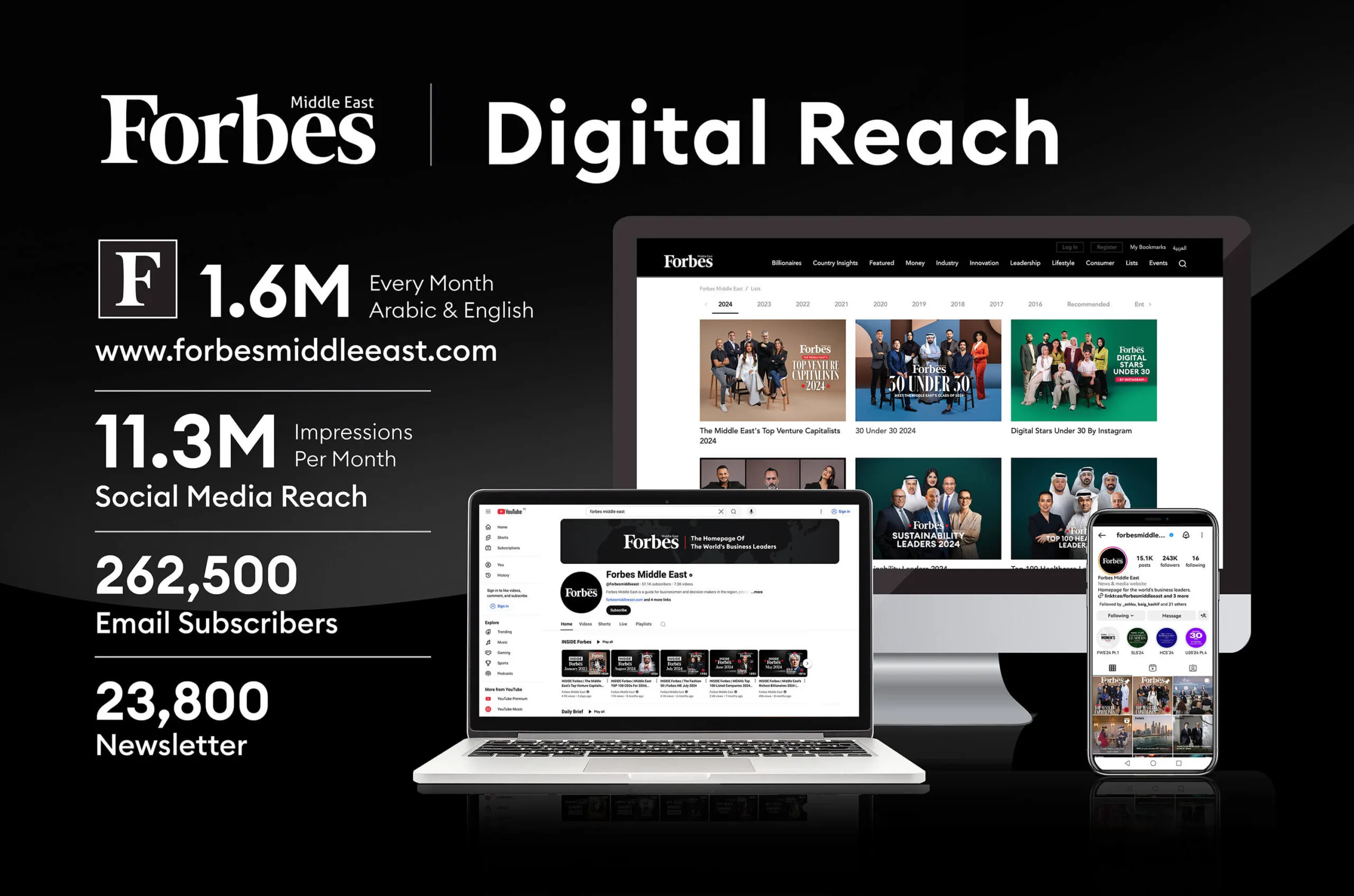 Forbes Middle East is a licensee of Forbes Media and extends the Forbes brand of journalism across the Arab world. Forbes Middle East’s distinctive editorial style attracts a readership of Arab leaders, entrepreneurs, C-level executives, government officials and investors united by a belief in the spirit of free enterprise and entrepreneurial values.Across the region, Forbes Middle East sets the pace for preemptive business journalism. By uncovering trends and anticipating opportunities in the regional marketplace, each monthly issue brings top executives the information critical to their success – in both Arabic and English language editions. The magazine researches and publishes original rankings, based on methodologies set by Forbes Media.