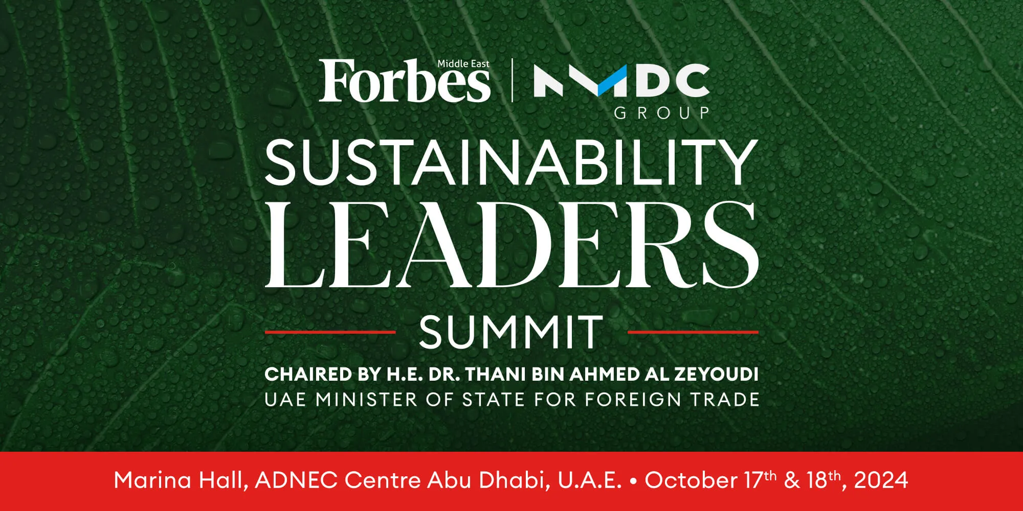 The second edition of the Forbes Middle East Sustainability Leaders Summit takes place in Marina Hall, ADNEC Center Abu Dhabi, UAE, from October 17 to 18, 2024, and centers around the theme of ‘Shaping a Sustainable Tomorrow’. Chaired by H.E. Dr. Thani bin Ahmed Al Zeyoudi, Minister of State for Foreign Trade for the UAE, the two-day event aims to accelerate action towards sustainable development and climate resilience, while encouraging economic growth.